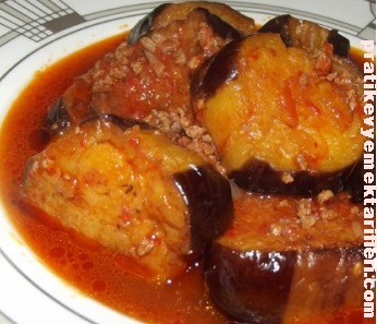 Patlıcanlar alacalı olarak soyup 1 -2 cm eninde halka halka doğranır. Tuzlu suda 1 saat kadar bekletilir. Sonra kızgın yağda pembeleşene kadar kızartılır. Fazla yağının gitmesi için peçete üzerine alınır. Tencereye 1-2 yemek kaşığı yağ konur ve soğan kavrulur. Ardından kavrulmuş kıyma eklenir. Salça, domates rendesi ve sarımsak sırayla eklenir ve kavrulur. Domatesler suyunu çekince 2-3 su bardağı su eklenir. Yaklaşık 10 dakika kaynatılır. Ardından patlıcanlar, tuzu ve baharatı eklenir. Yaklaşık 15 dakika kadar da birlikte kaynatılır. Yemek özleşince ocaktan alınır. Afiyet olsun…